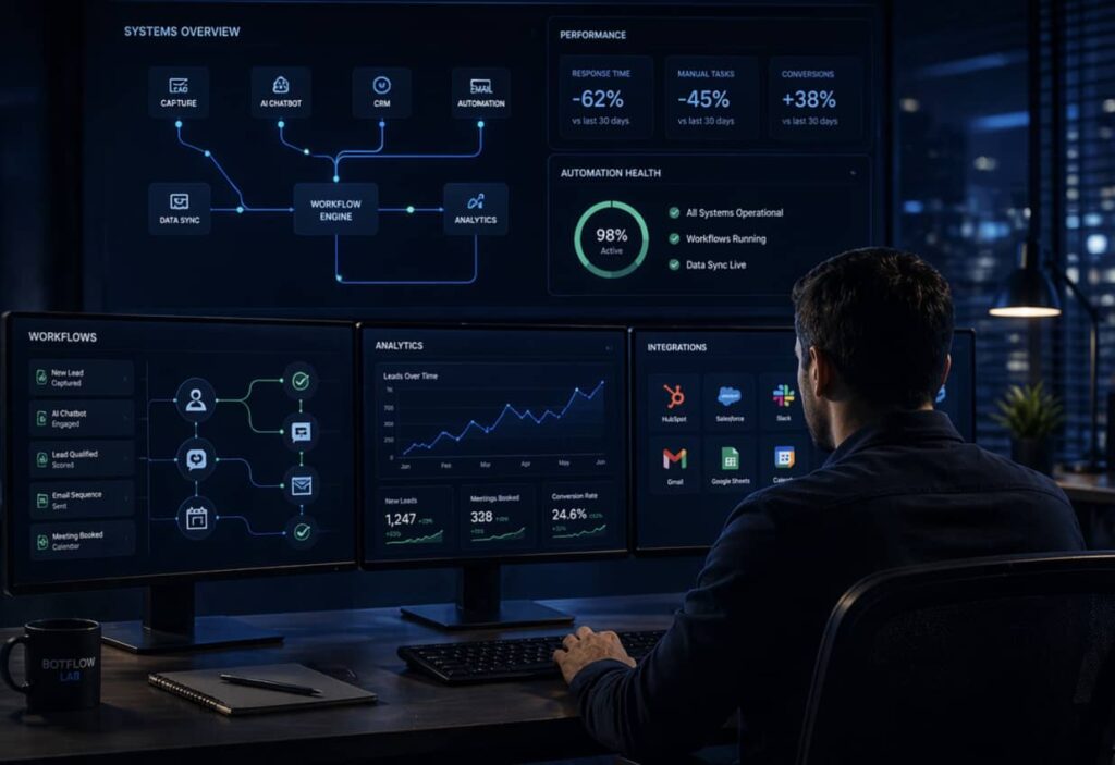 BotFlow Lab turns fragmented processes into seamless, data-driven experiences. Our platform blends agentic AI chatbots, no-code workflow automation, and real-time analytics to accelerate every stage of the customer journey, from first click to retention. Clients cut response times by 60%, reclaim thousands of manual hours, and surface insights that fuel continuous optimization. Whether you’re scaling support, nurturing leads, or orchestrating fulfillment, we partner end-to-end: discovery, design, deployment, iteration.